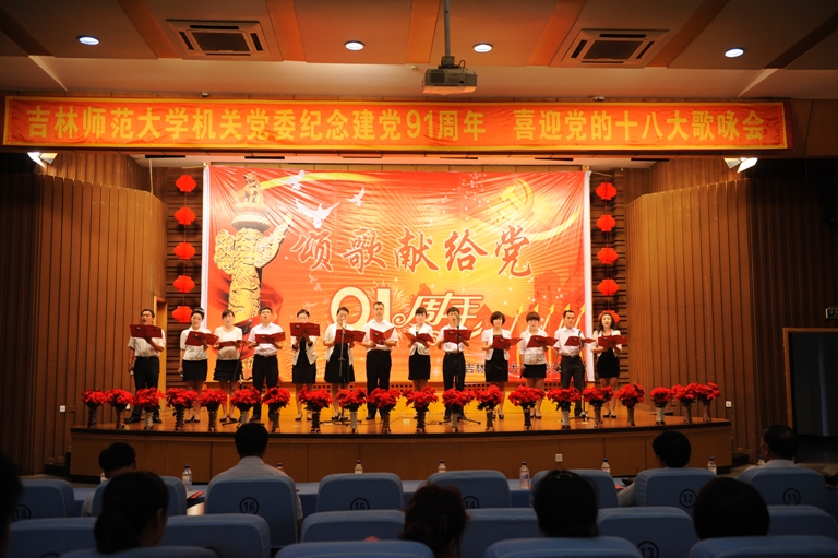 为庆祝中国共产党成立91周年,迎接党的十八大胜利召开,6月29日下午,我校机关党委“颂歌献给党”庆祝建党91周年歌咏会在图书馆报告厅举行。校长张伯军,校党委副书记高林波,副校长齐奎、杨景海出席并观看了演出,学校相关部门负责人、部分师生代表观看了演出。