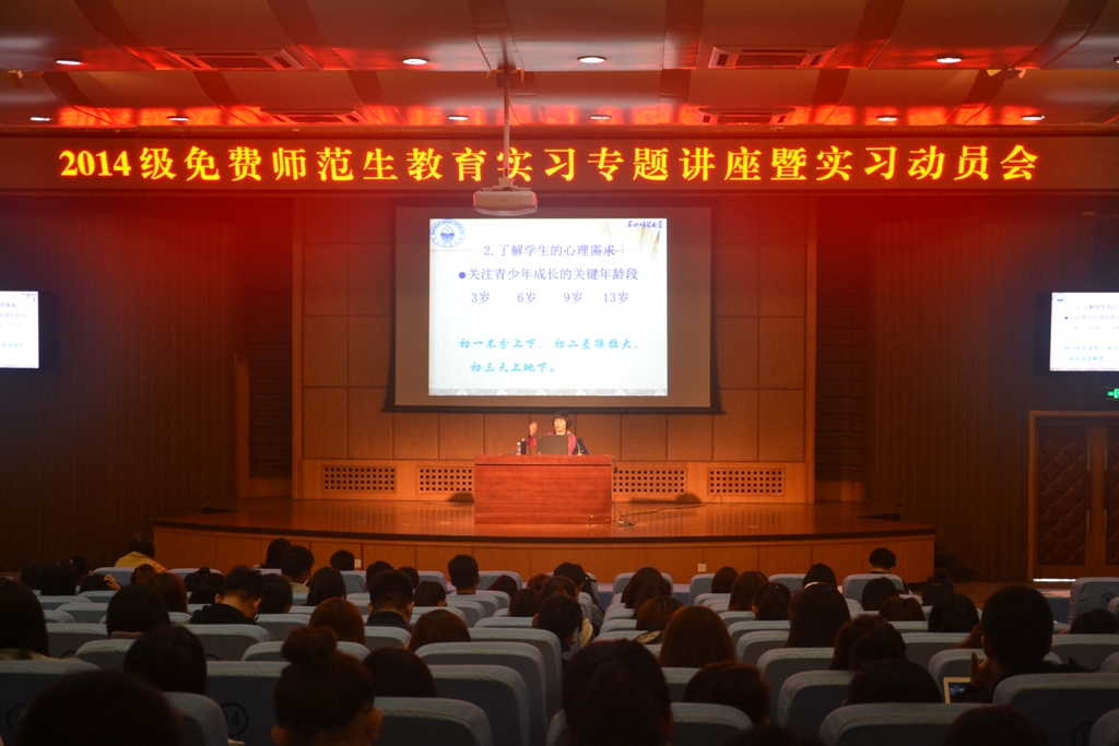 为进一步做好我校2014级免费师范生的教育实习工作,提高其职业技能和从教能力,为教育实习做好思想准备和业务准备,4月12日,学校在图书馆报告厅举办了2014级免费师范生教育实习专题讲座暨实习动员会,免费师范生所在学院的教学院长、系主任、学科教学论教师,以及2014级全体免费师范生参加了会议。